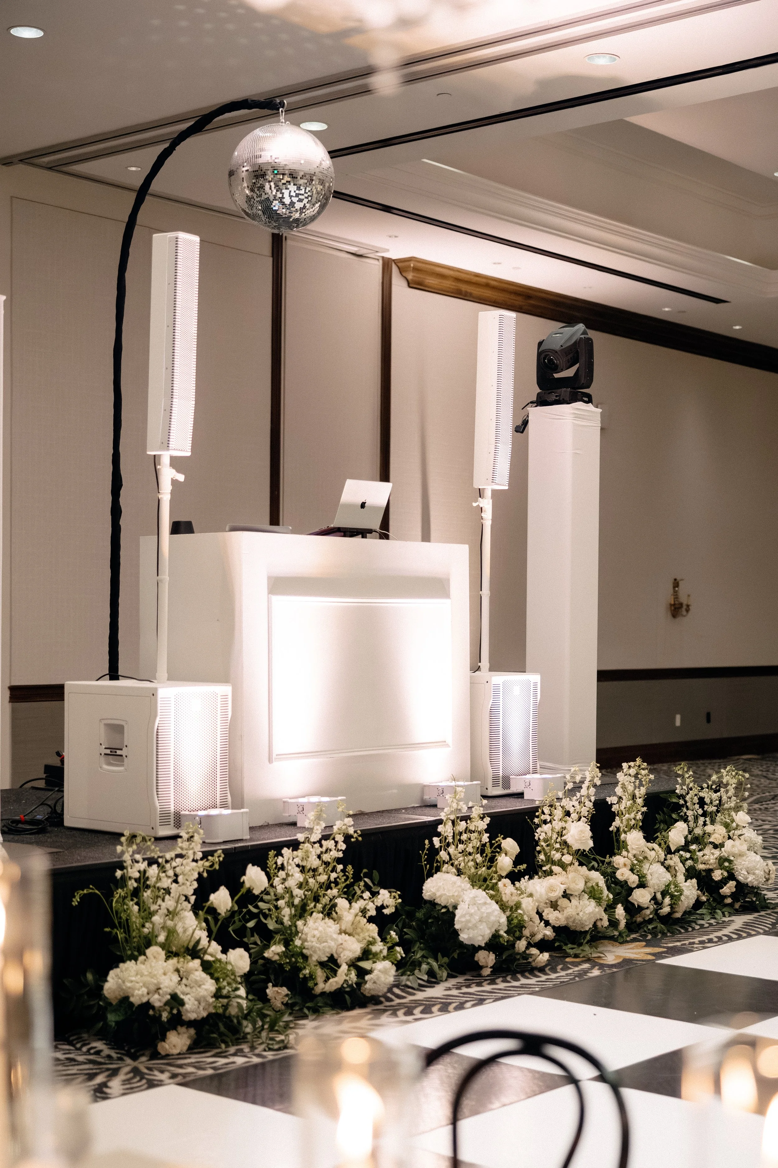 An all white DJ booth furniture and matching speakers to blend into the décor.