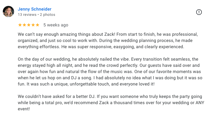 Poor Communication. Imagine the stress of never hearing back from your DJ, forcing you to scramble on final music details the week of your wedding—right when family arrives and the last thing you want is chasing playlist confirmations. We provide Dedicated Support—A full-time assistant keeps everything organized, so you stay relaxed amid last-minute chaos. Count on us for seamless communication from booking to big day.